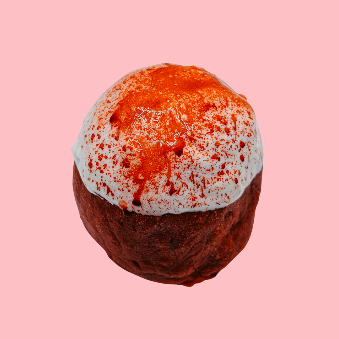 Red velvet cookie base loaded with Little Debbie® Star Crunch® bars, Ghoulish Green Twix®, and cream cheese chips. Stuffed with dulce de leche gooey red velvet butter cake and Snickers® Buttercream, then finished with a white chocolate shell and edible “blood” splatter.