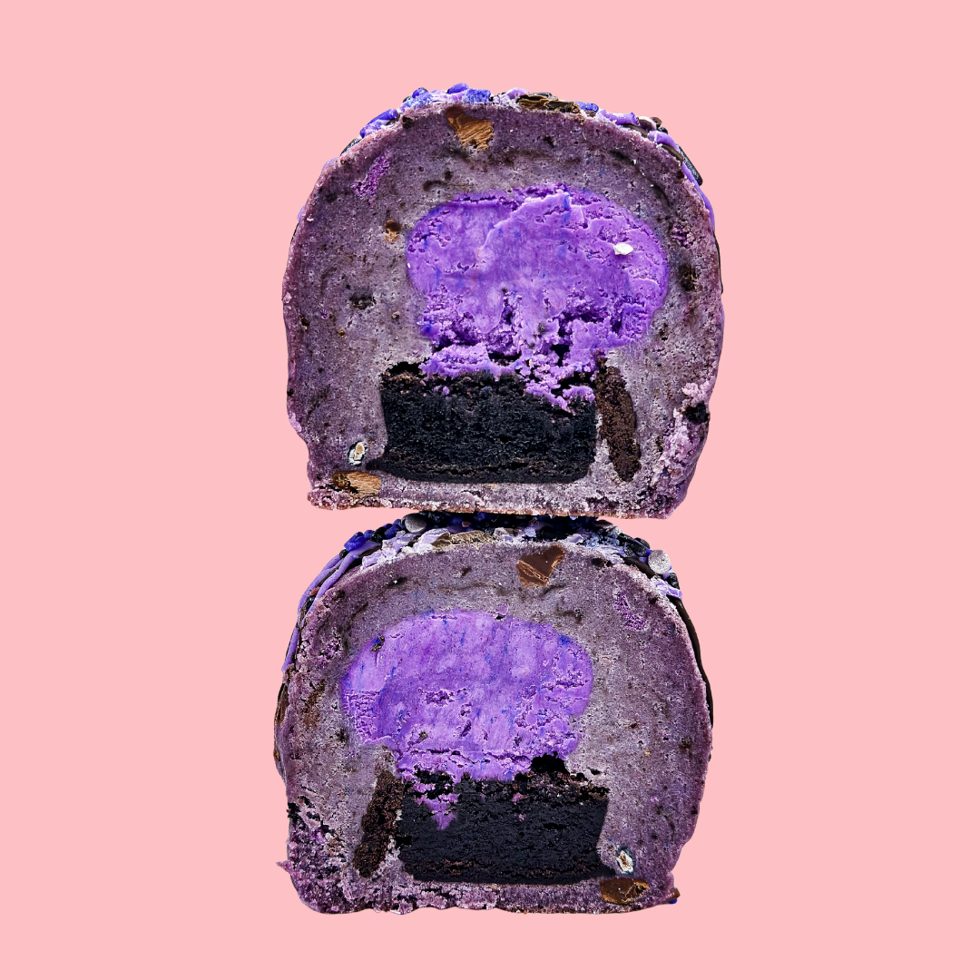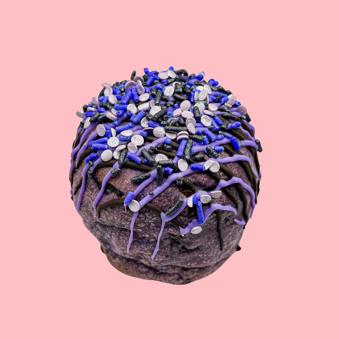 Deep purple ube cookie base with ube pillows, Oreo® cookies, black-coated M&M’s®, and dark chocolate chips. Stuffed with a black velvet fudge brownie and ube buttercream, drizzled with black and purple chocolate, and topped with Wednesday Addams–themed sprinkles.