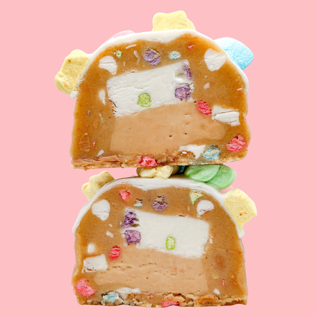 Angie’s signature peanut butter marshmallow cookie base, Lucky Charms™ marshmallows, REESE’S® white chocolate cups, and a mix of white chocolate chips and peanut butter chips. Stuffed with Lucky Charms™ marshmallow fudge and peanut butter buttercream, dipped in marshmallow frosting, and topped with Lucky Charms™ marshmallows. (CONTAINS PEANUTS)