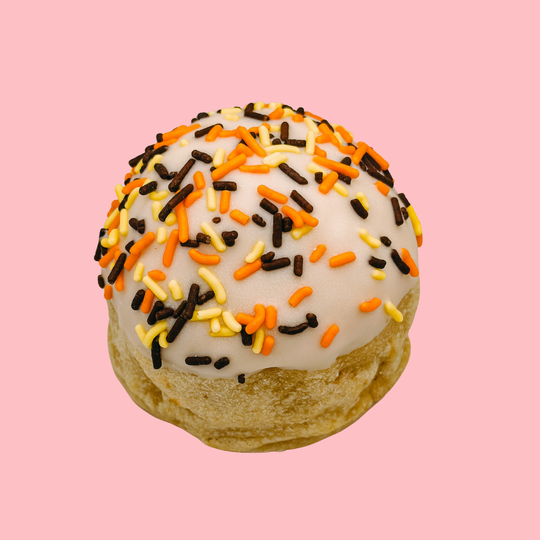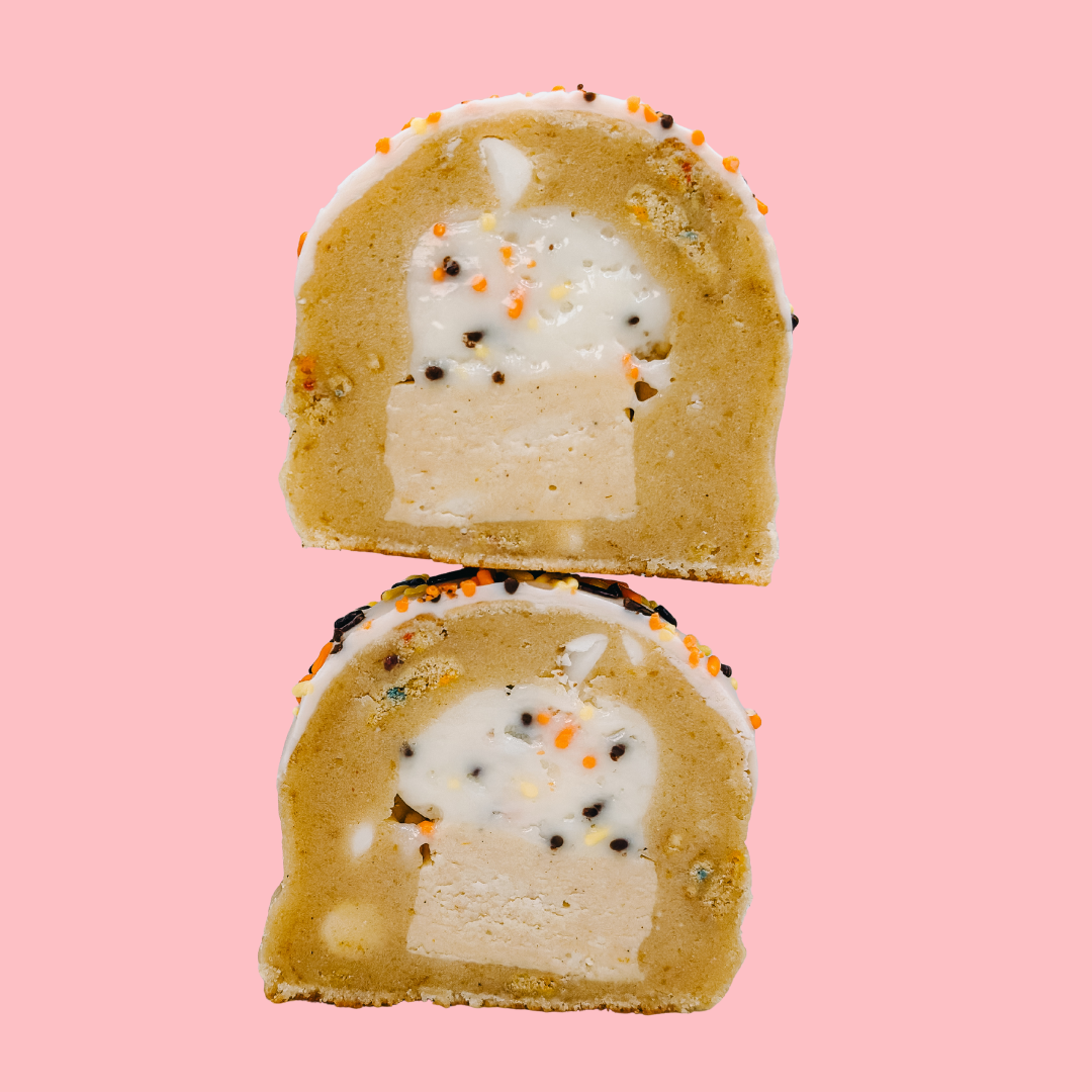 Pumpkin birthday cake cookie base packed with Tate’s® Pumpkin Cookies, Hostess® Pumpkin Twinkies®, Annie’s® Birthday Cake Bunnies™, and white chocolate chips. Stuffed with pumpkin fudge + fall confetti buttercream. Dipped in pumpkin-flavored frosting + finished with fall sprinkles.