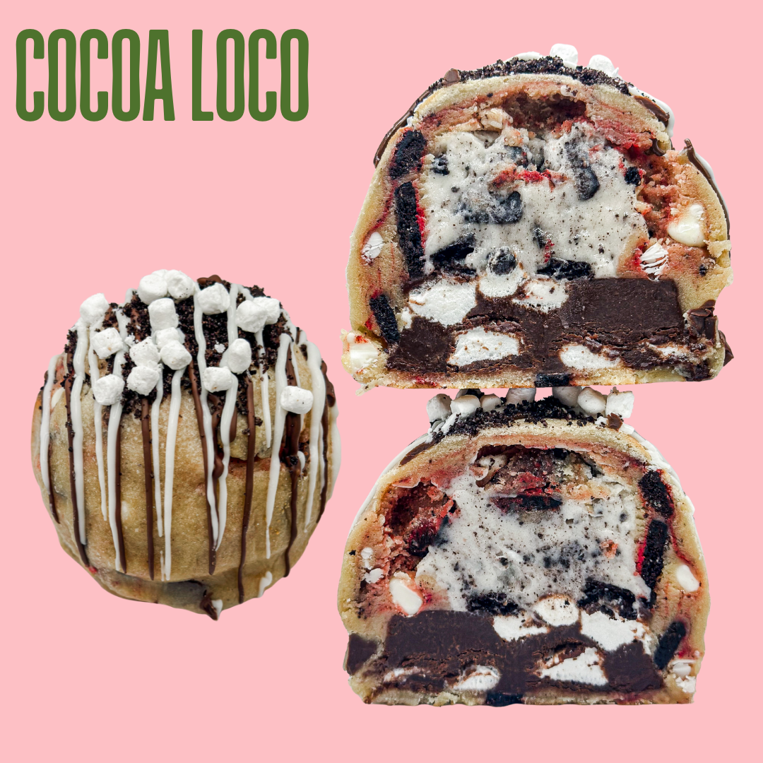 Cookies ’n cream cookie base loaded with Christmas Oreos©, Hershey’s® Hot Cocoa Kisses, Chips Ahoy!® Hot Cocoa Cookies, and hot cocoa baking chips.