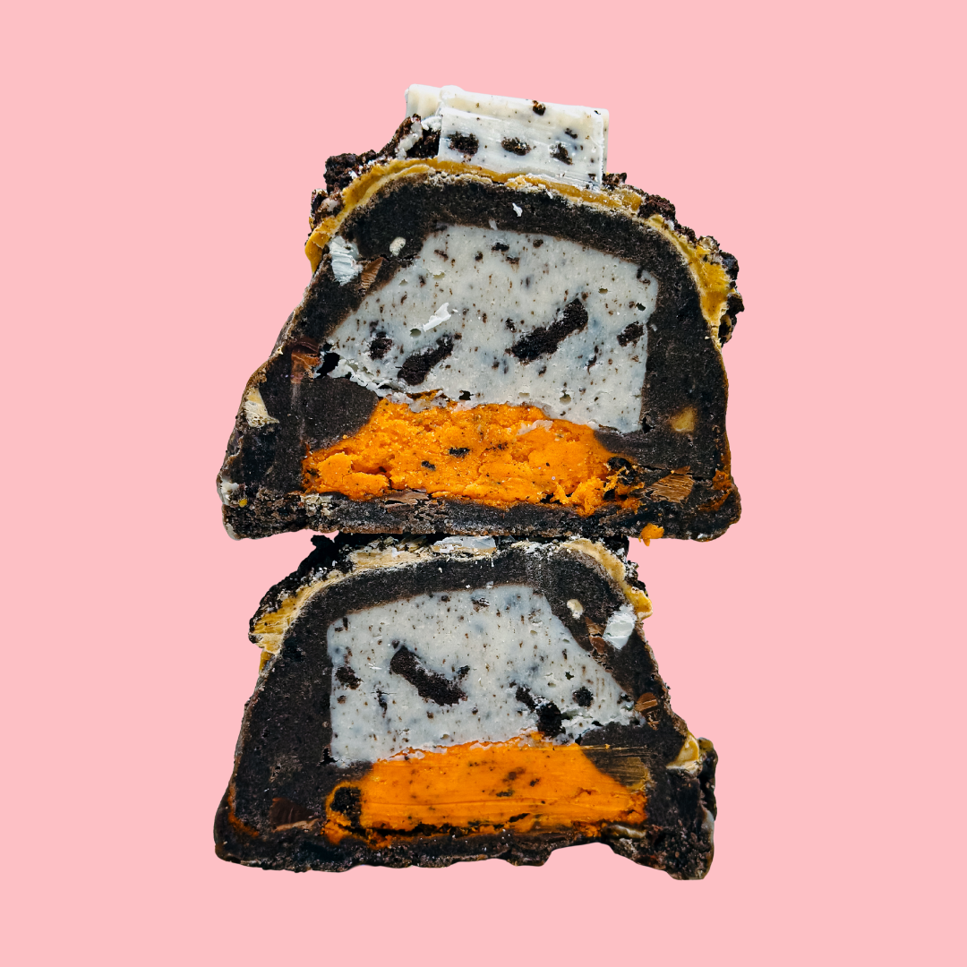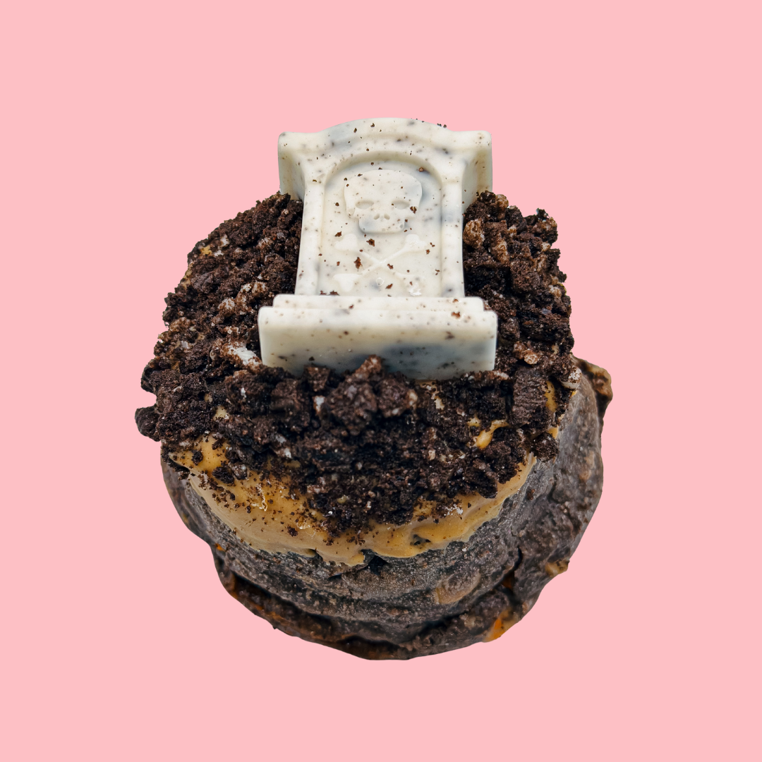 Black cocoa cookie base loaded with Reese’s® Oreo® Peanut Butter Cookies, Reese’s® Peanut Butter Cups, and a mix of Reese’s® Peanut Butter Chips and semi-sweet chocolate chips. Stuffed with cookies ’n’ cream peanut butter fudge and dyed-orange cookies ’n’ cream frosting. Dipped in peanut butter, topped with Oreo® crumbs, and finished with an edible “tombstone.”